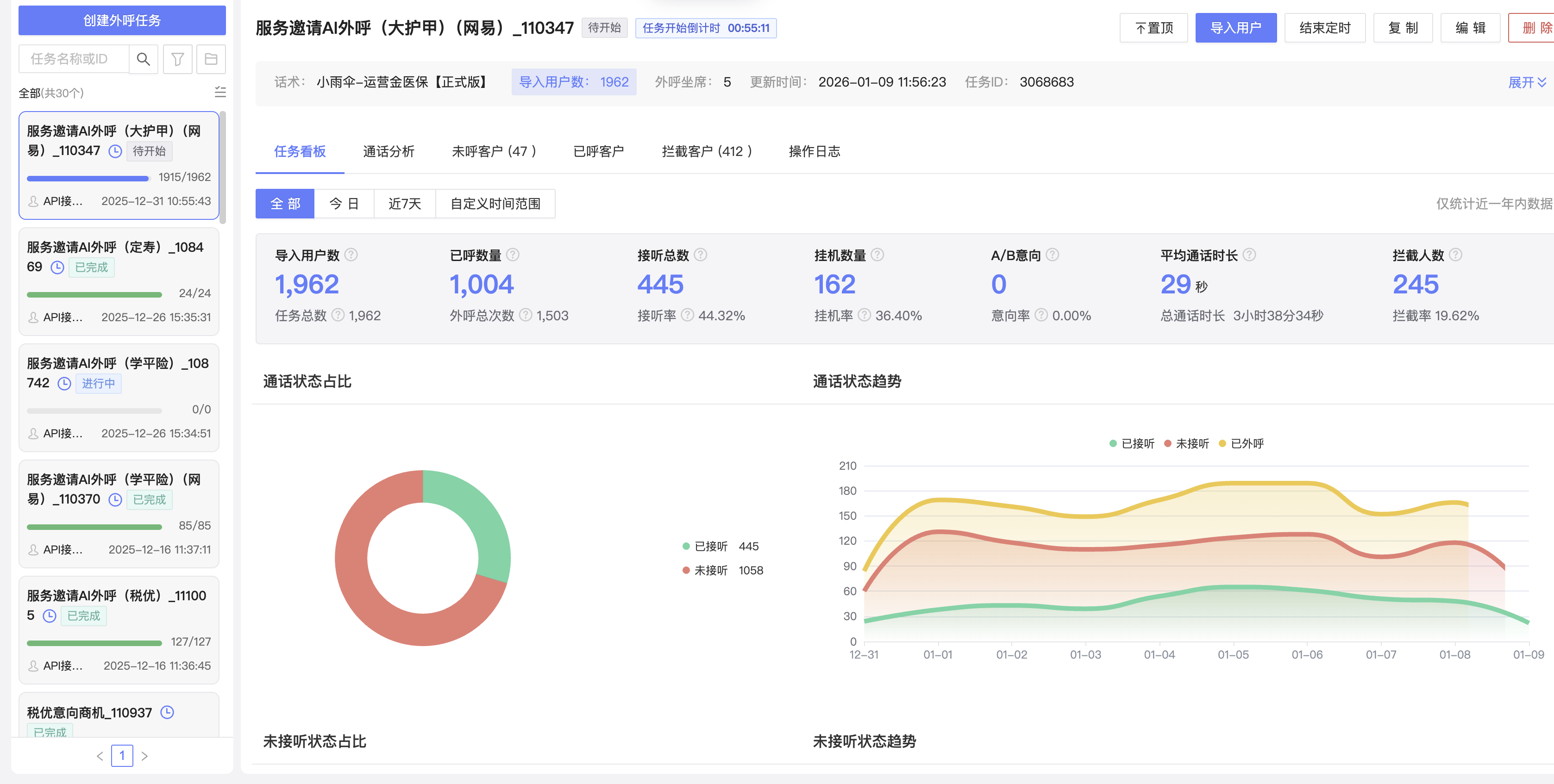 对接新线路,测试最高接通率时段/重播策略,监测异常情况